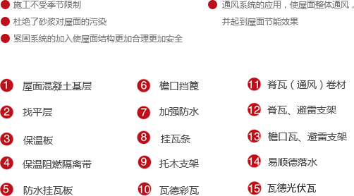 借鑒歐洲坡屋面防水理念,將平面防水改為立體防水,采用新型防水板材料,將材料防水和構(gòu)造防水于一身,配合屋面系統(tǒng)組件,實(shí)現(xiàn)全天候全干作業(yè)。節(jié)省了屋面各類保護(hù)層次,打破了屋面冬季及雨后陰濕無(wú)法施工的常規(guī),縮短了工期,提升系統(tǒng)安全性能。